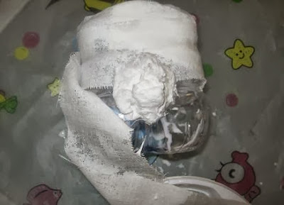 Un po' più sotto della metà dell'altezza della bottiglia, posizionare un batuffolo di ovatta intriso di colla. Sarà il naso della mummia.